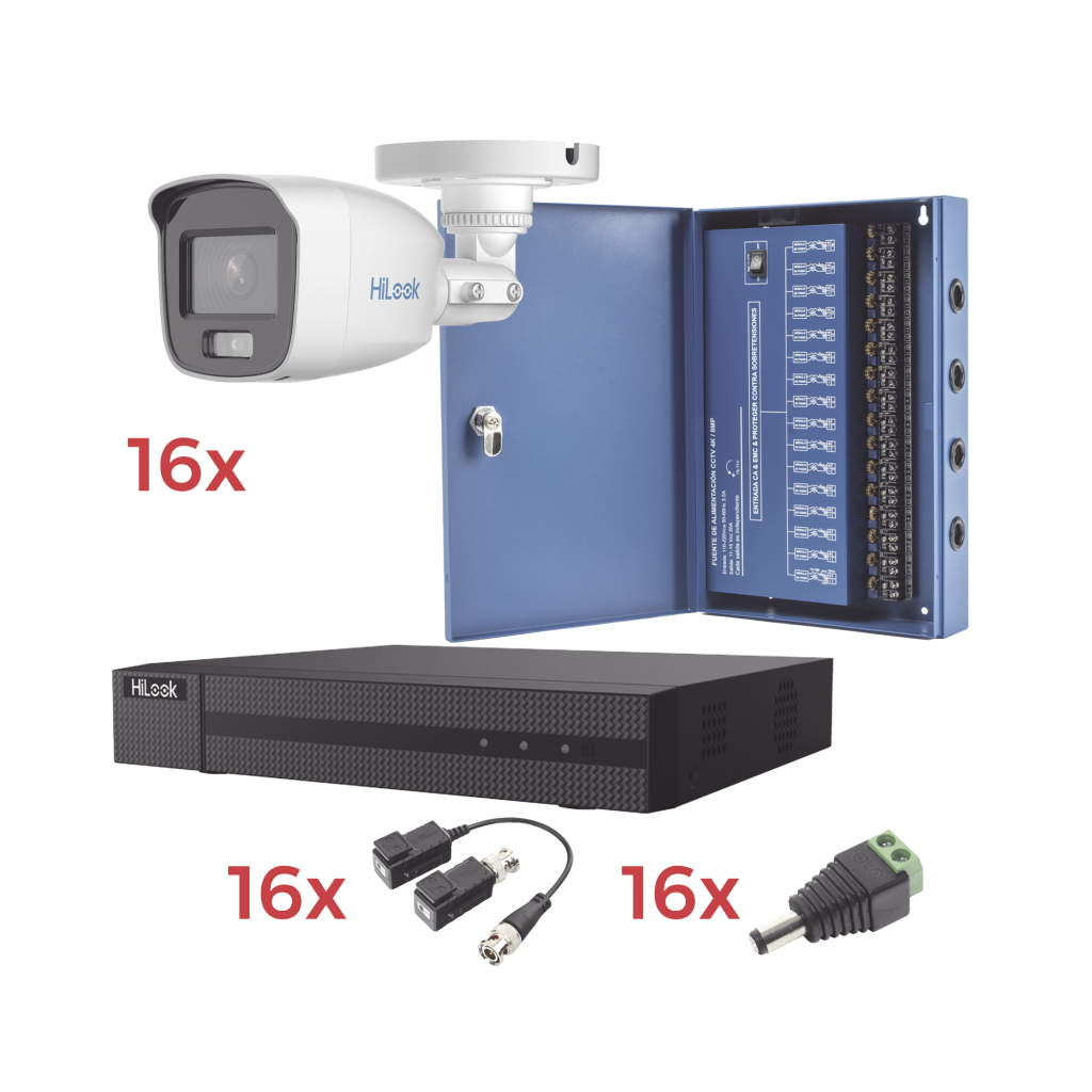 - – Incluye: 1 DVR de 16 Canales, 16 Cámaras de 2MP, 16 Transceptores, 16 conectores tipo Jack, 320 metros de cable y Fuente de poder para 16 Cámaras